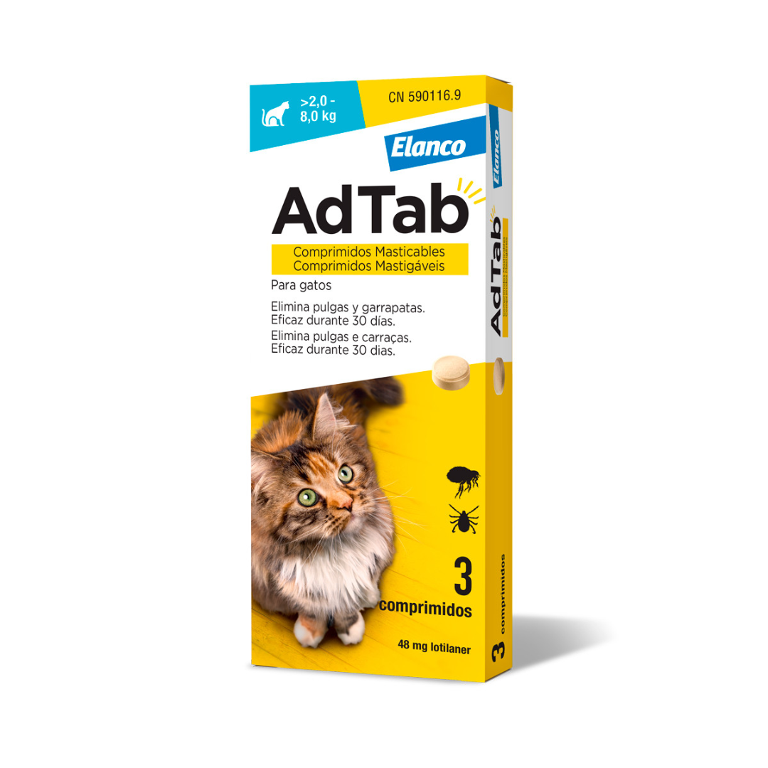 Adtab Comprimidos 48 mg Gatos >2-8kg 3 unidades é um medicamento veterinário que tem atividade imediata e persistente na eliminação das pulgas (Ctenocephalides felis e C. canis) e carraças (Rhipicephalus sanguineus, Ixodes ricinus, I. hexagonus e Dermacentor reticulatus) durante 1 mês. As pulgas e as carraças devem estar fixas no hospedeiro e iniciar a alimentação de modo a serem expostas à substância ativa.