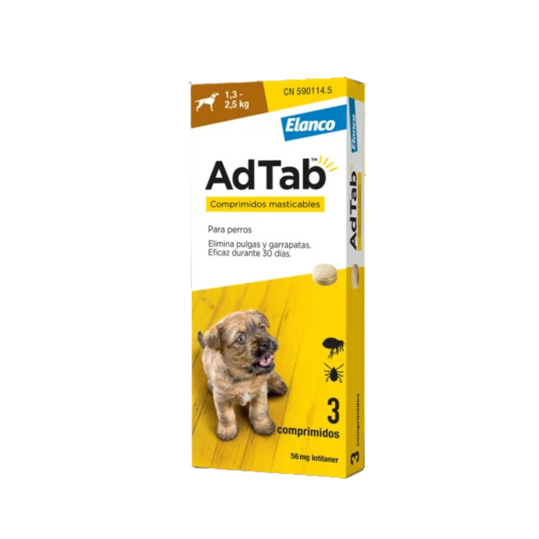Adtab Comprimidos 56 mg Cão 1.3-2.5 kg é um medicamento veterinário que tem atividade imediata e persistente na eliminação das pulgas (Ctenocephalides felis e C. canis) e carraças (Rhipicephalus sanguineus, Ixodes ricinus, I. hexagonus e Dermacentor reticulatus) durante 1 mês. As pulgas e as carraças devem estar fixas no hospedeiro e iniciar a alimentação de modo a serem expostas à substância ativa.